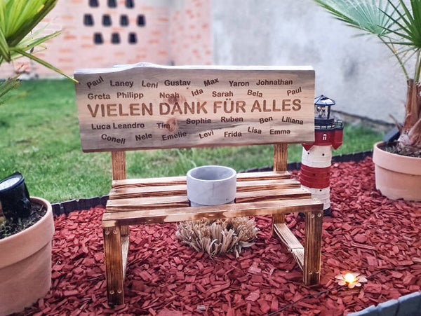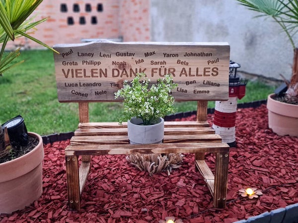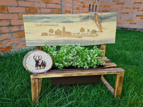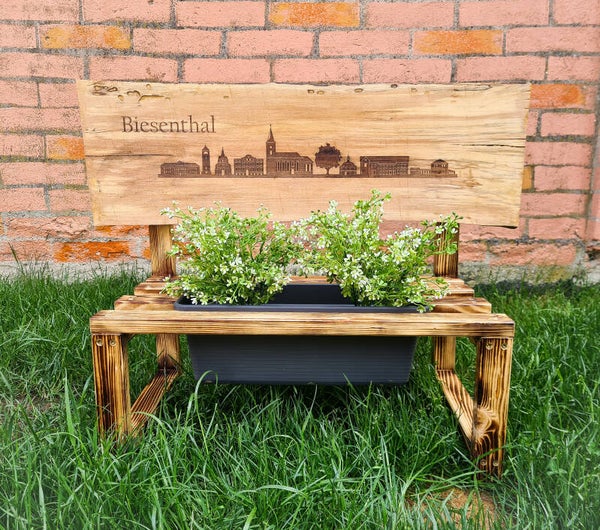 Ein besonderes Extra: Auf Wunsch versehen wir deine Blumenbank mit einer individuellen Gravur – ideal als persönliches Geschenk oder als einzigartiger Blickfang in deinem Zuhause.